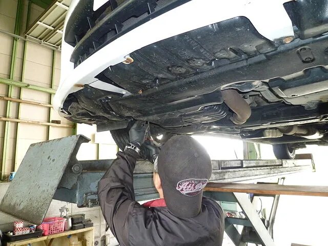 リフトで持ち上げられた車両の下、整備士が丁寧に作業を進めています。